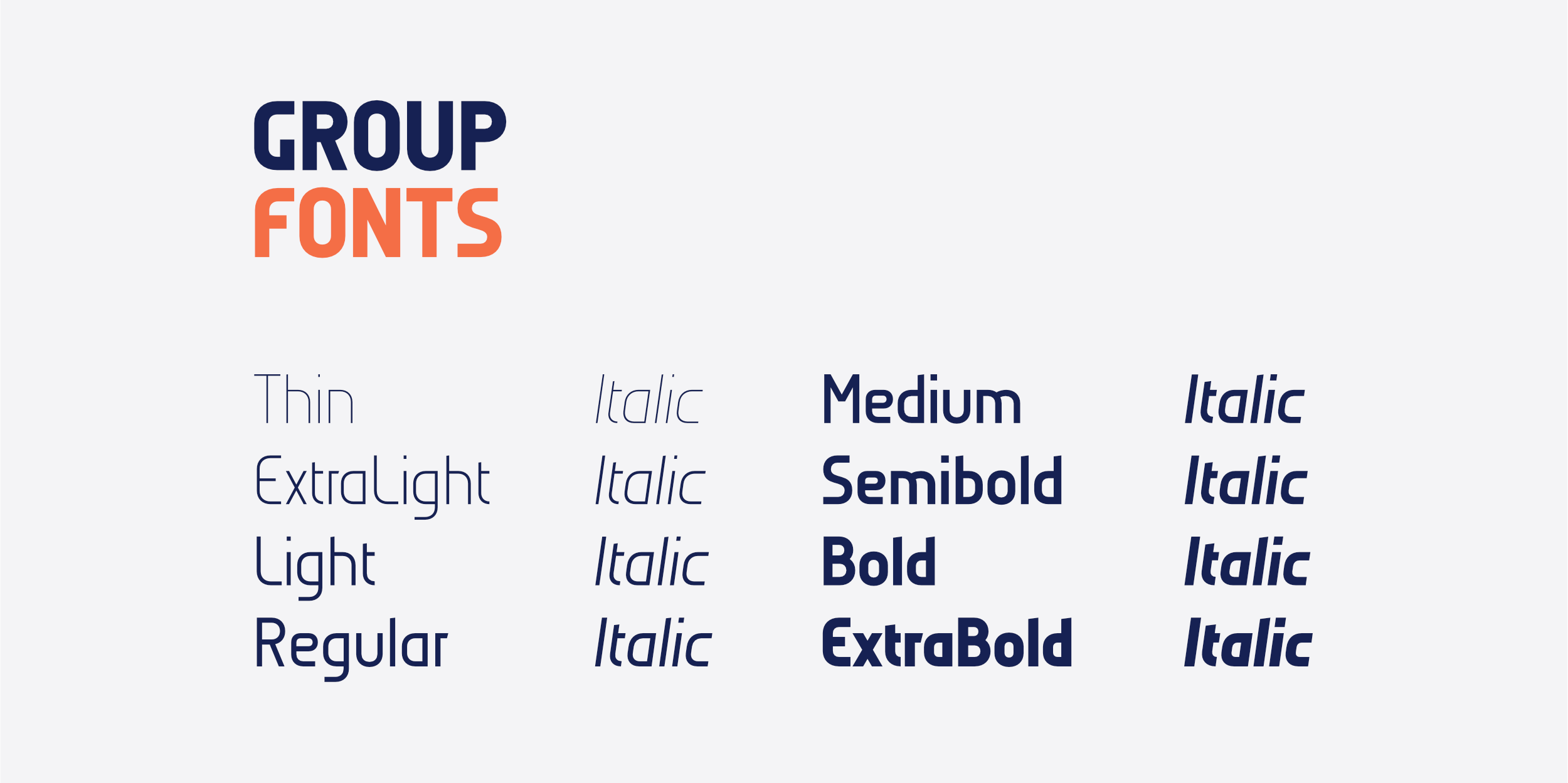 The font family includes eight weights – from Thin to Extra Bold – each with matching italics. This wide range offers versatile design possibilities for creating a consistent yet expressive typographic identity. Group is perfectly suited for logo design, branding, editorial, and graphic design. With its balanced construction and refined aesthetics, it delivers a clear visual presence in both print and digital applications.