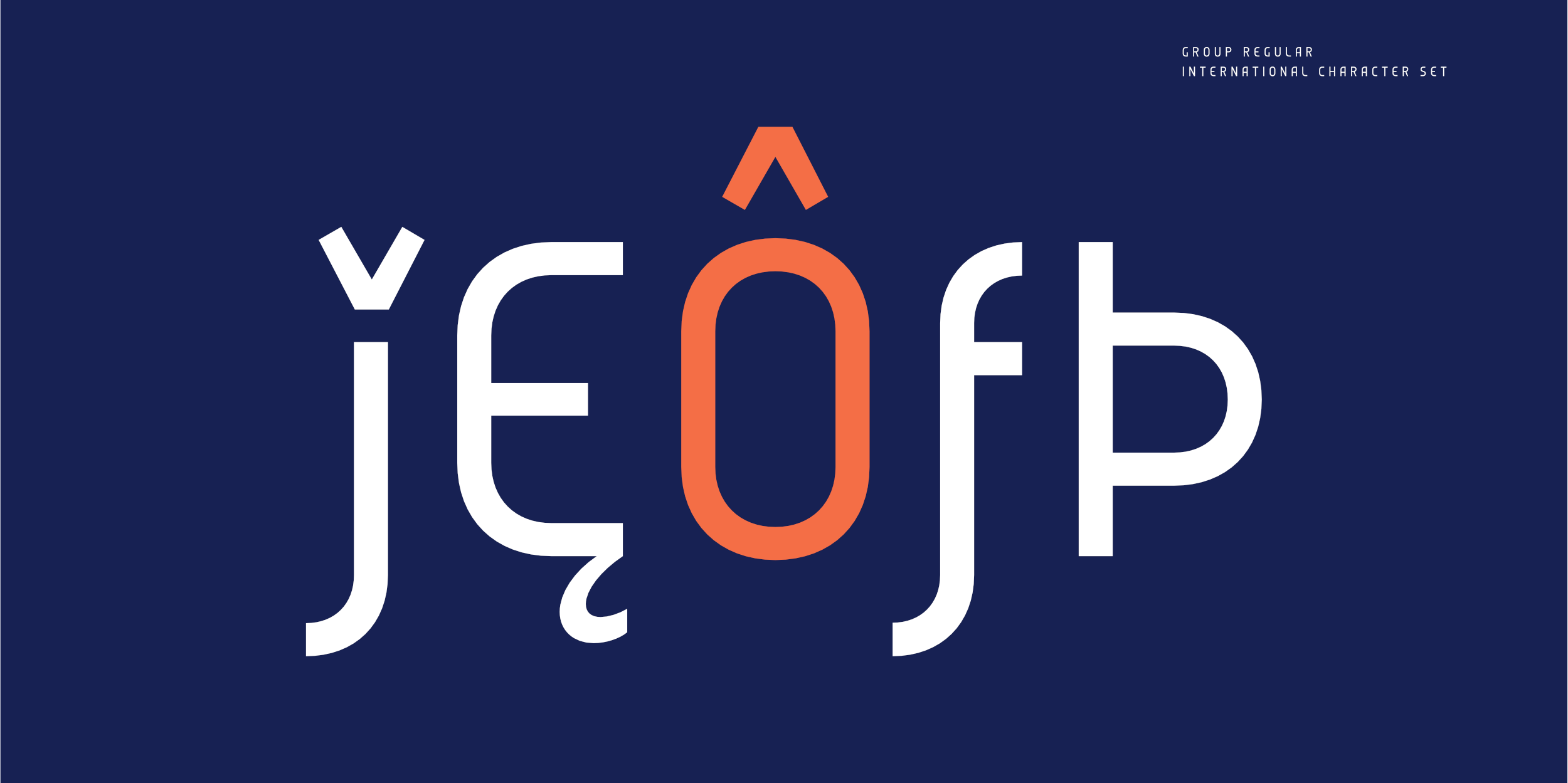 Group is a modern display typeface family consisting of 16 styles and two variable fonts. It features a distinctive character, monolinear shapes, and a clean geometric design language. The letterforms are defined by modern proportions and precise detailing, giving the typeface a unique and contemporary appearance.